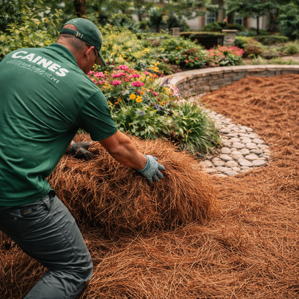 Fresh pine straw and mulch installation to improve curb appeal, retain soil moisture, and protect plant beds during Georgia’s seasonal changes.